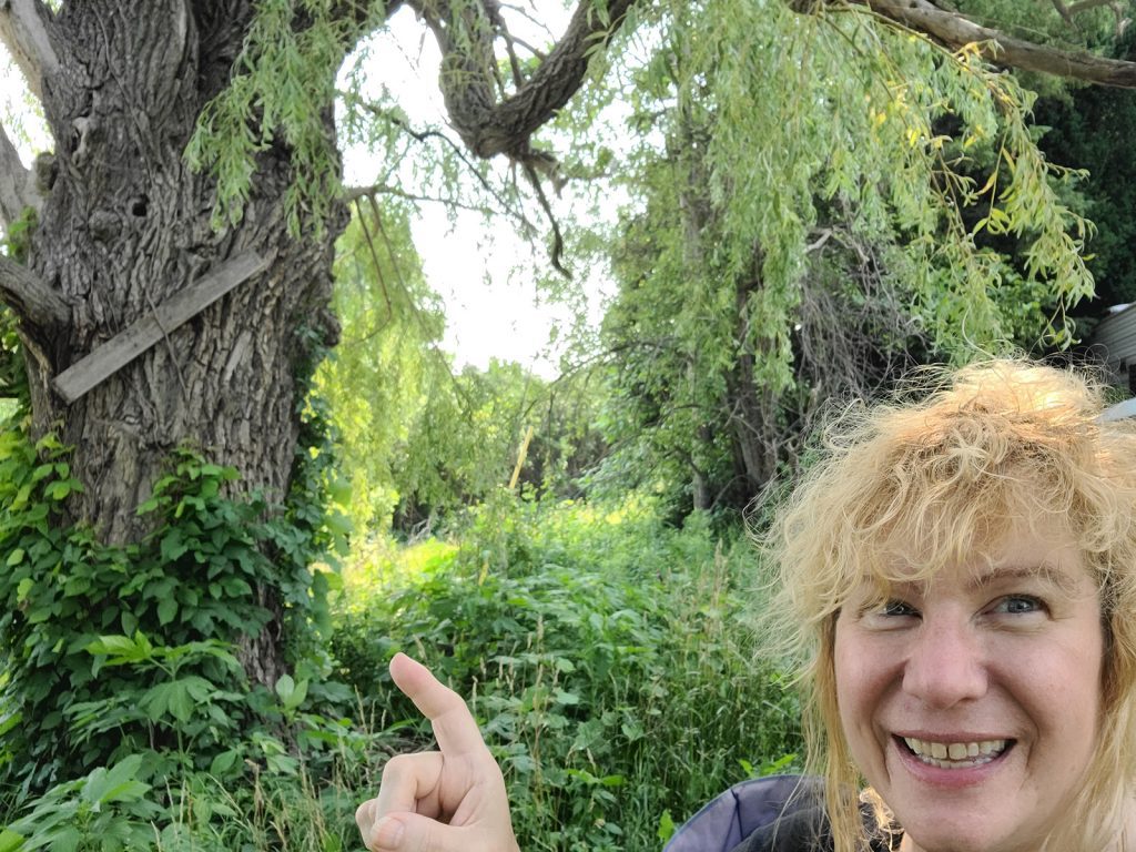 Cottonwoods may be “Mama Trees” in general to me, but there was ONE tree that was MY “Mama Tree” — a huge weeping willow that stood at the front of our property. This stately old lady still stands… but she is a shadow of her former self. Here’s a pic of her now, with my Mate beneath her boughs, trimming dead weight: