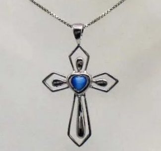 sterling silver cross necklace with small blue moonstone heart -- available on Ruby Lane