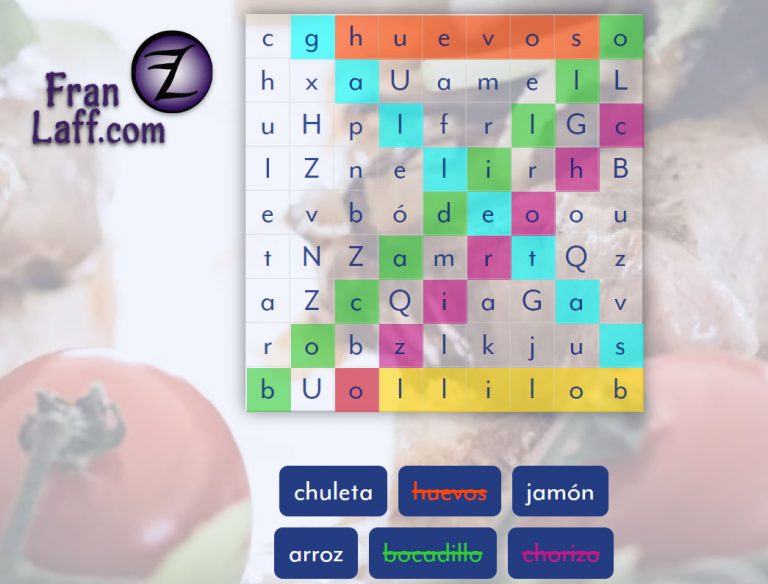 search for Spanish names for meats, nuts, seafood, and other proteins, along with potatoes and other starchy foods in this FREE interactive wordsearch