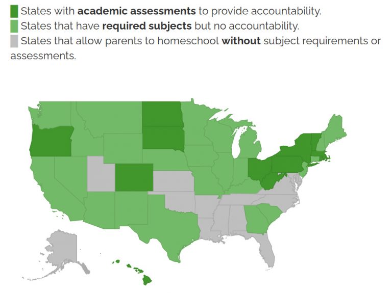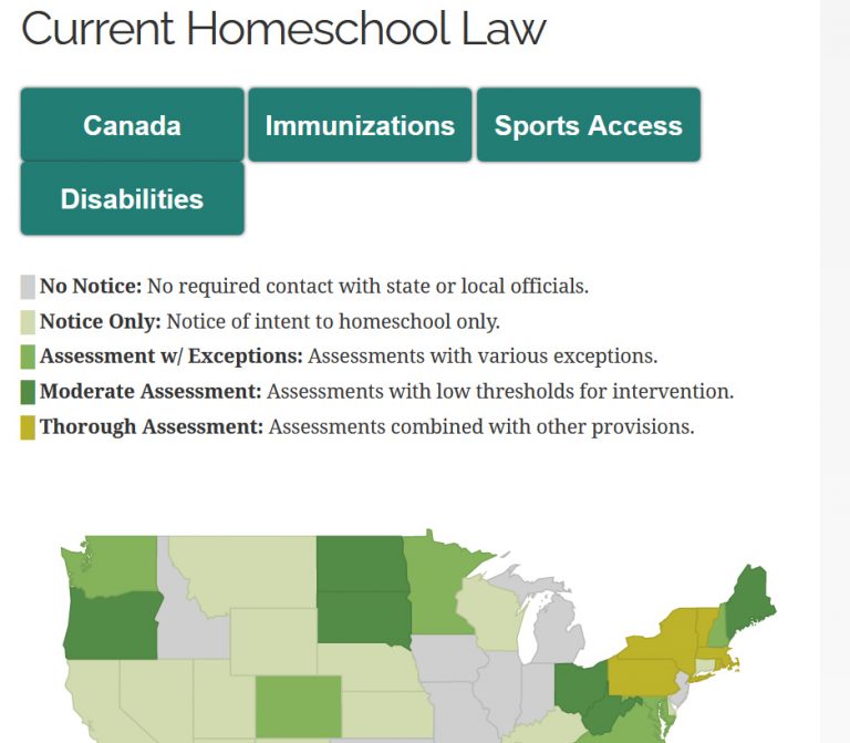 Quick overview of homeschool law by state, all on one page of maps, by CRHE