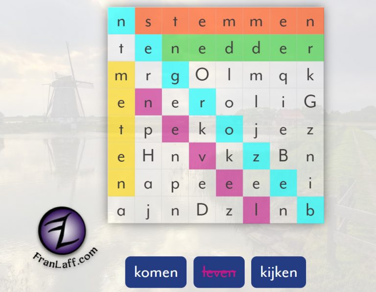 Search from a list of 120 most commonly used Dutch verbs in their infinitive form, in this FREE online wordsearch puzzle!