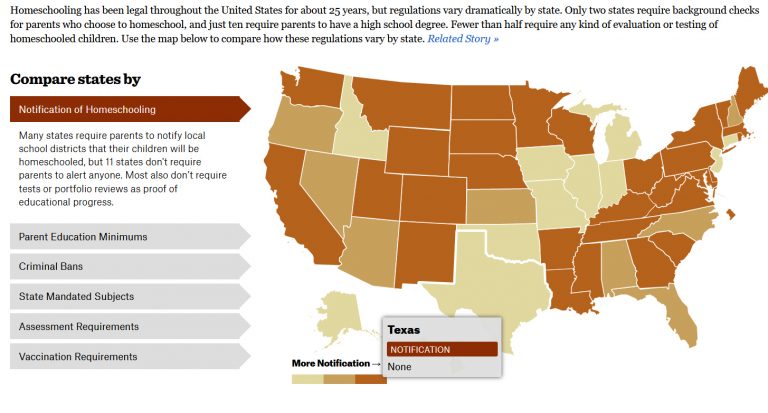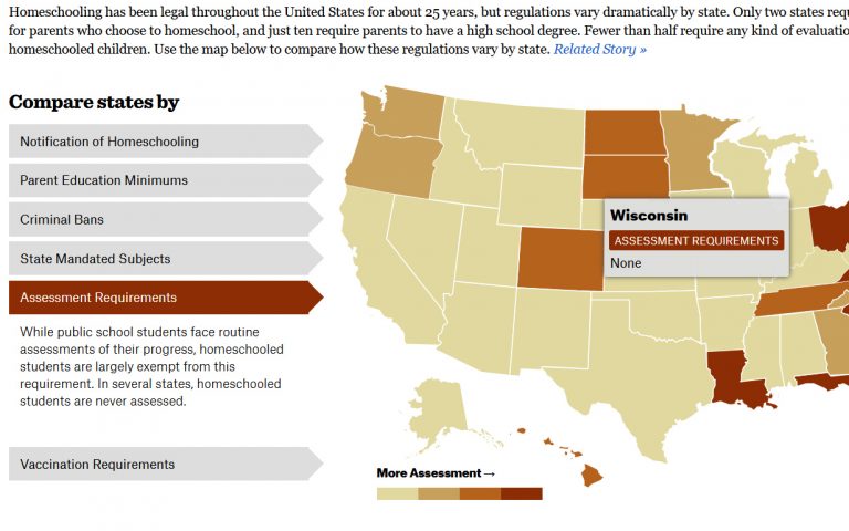 Compare homeschool regulations between US states at a glance with this map created by Pro-Publica