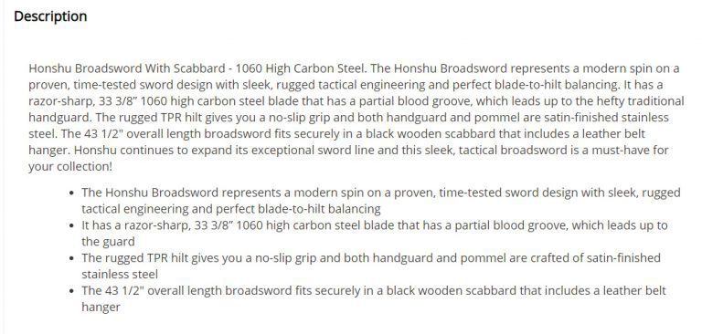 43 inch high carbon steel broadsword with scabbard from SwordsKnivesAndDaggers.com