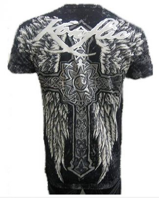 cotton t-shirt with black and white cross and wings design -- available on Amazon