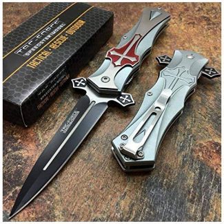 5" closed folding black blade pocket knife with red cross on silver handle -- available for about $10 USD on Amazon