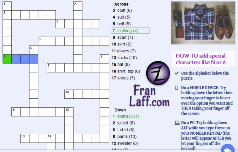practice Spanish words for clothing and accessories in this FREE online interactive crossword puzzle