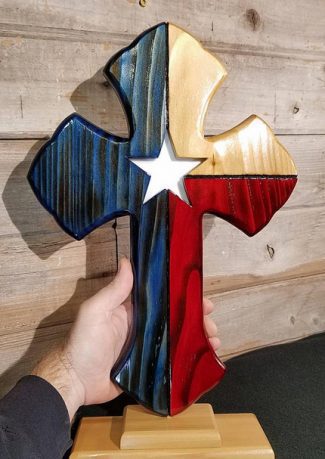 Wooden cross on a stand, painted with the Texas flag with a lone star in the center, for sale on Etsy