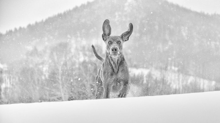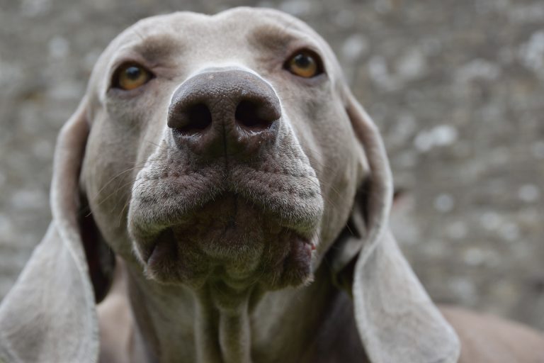 The weimaraner is a rather large champagne-colored sporting dog breed that was originally developed in 19th century Germany to hunt large animals such as bears and boar.