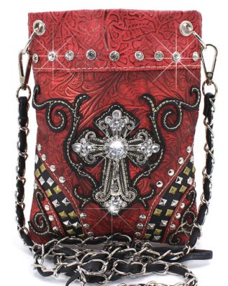 tooled leather cross hip bag in blue or red, available on Tawgear