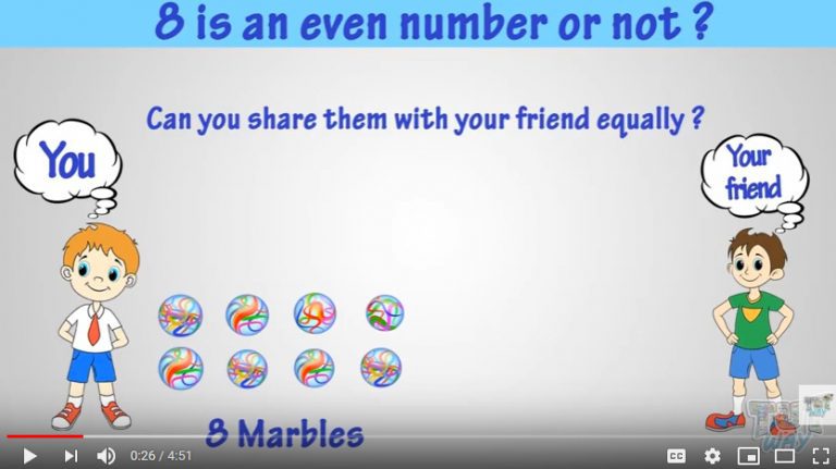 A cartoon video teaching odd and even numbers by dividing equally into 2 parts or not.