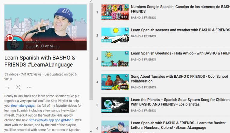 Learn Spanish with BASHO YouTube channel teaching kids Spanish (and a few other languages) through song and fun graphics