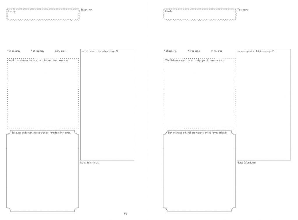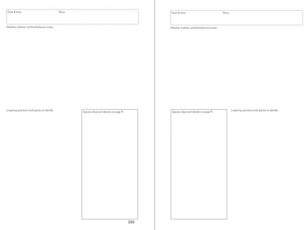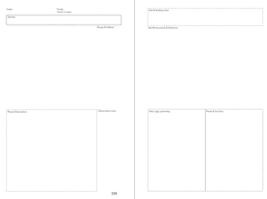 There are also pages to record information on 30 separate observation periods, from your own backyard to local parks and adventures afield.Â