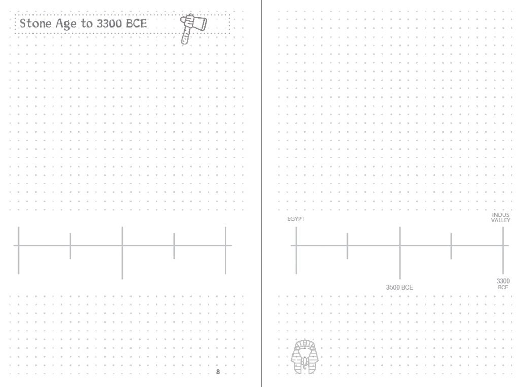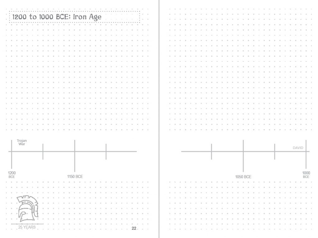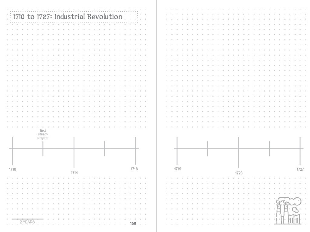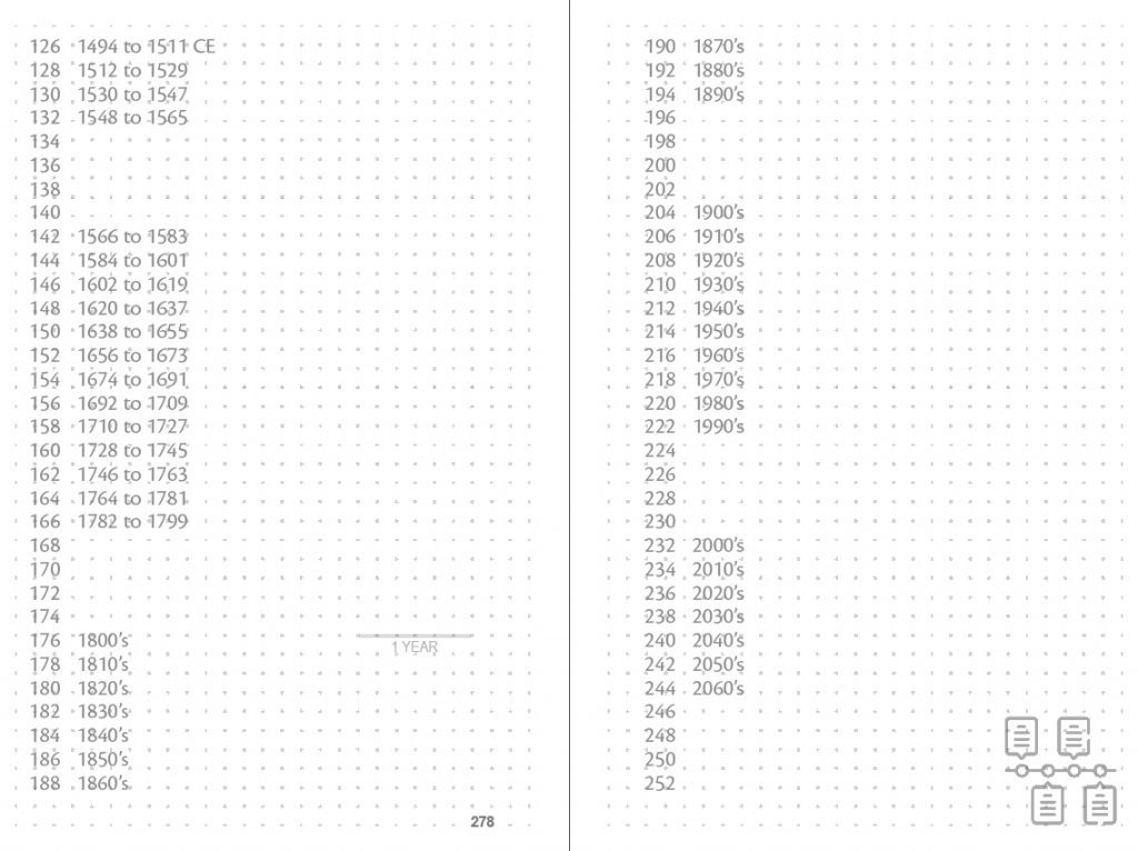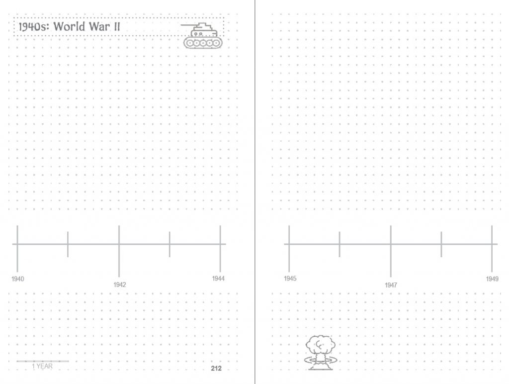 Jo Timeline History Learning Journal features one main timeline spanning from prehistory to the 2060’s, varying in scale from approximately 100 years per inch, down to 1 year per inch. This main timeline is broken into sections with eight pages between each: four blank dot-grid pages for general notes, and four pages of blank timelines for creative use such as for recording events within individual empires, wars, or other timeframes. These independent timelines are placed perpendicular to the main timeline to avoid confusion and to allow the user to create a slightly longer timeline per page. Additional blank timelines and note pages appear at the end of the book, along with a specialized index showing the years covered on each page, as well as the time scales used.