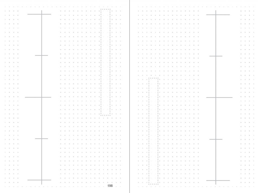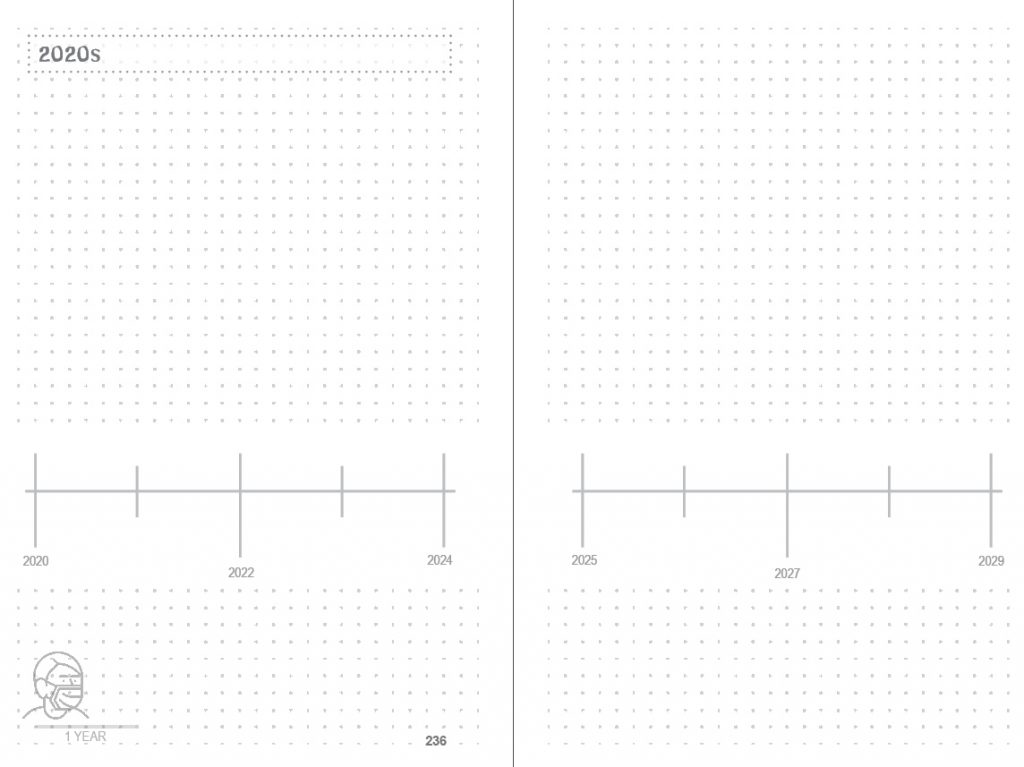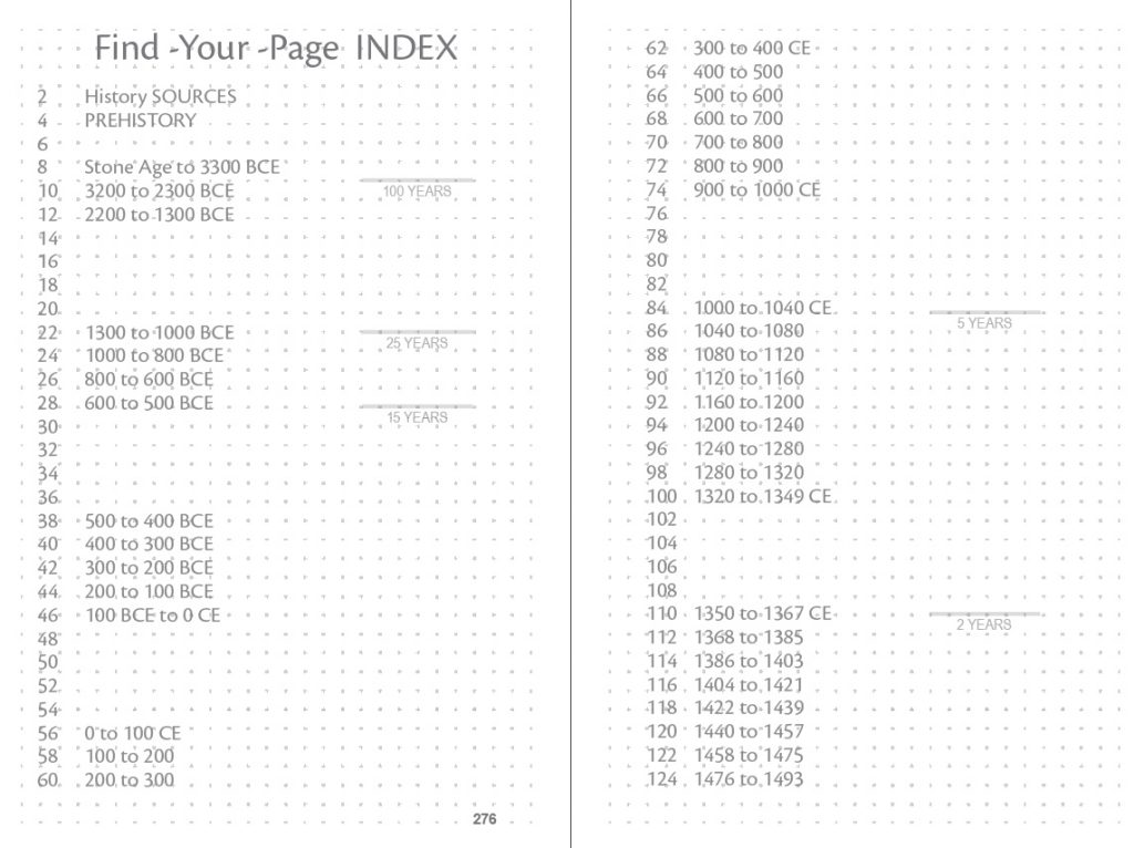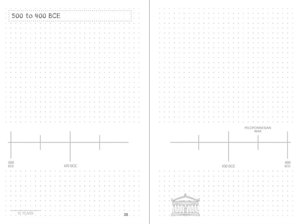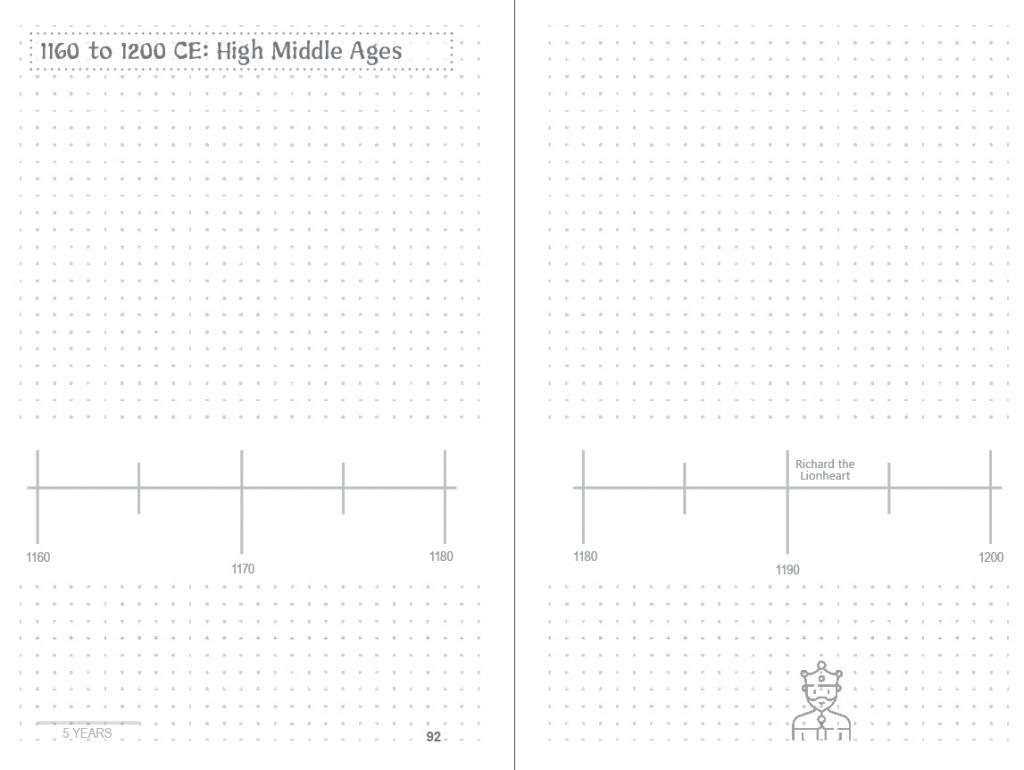 Jo Timeline History Learning Journal features one main timeline spanning from prehistory to the 2060’s, varying in scale from approximately 100 years per inch, down to 1 year per inch. This main timeline is broken into sections with eight pages between each: four blank dot-grid pages for general notes, and four pages of blank timelines for creative use such as for recording events within individual empires, wars, or other timeframes. These independent timelines are placed perpendicular to the main timeline to avoid confusion and to allow the user to create a slightly longer timeline per page. Additional blank timelines and note pages appear at the end of the book, along with a specialized index showing the years covered on each page, as well as the time scales used.