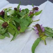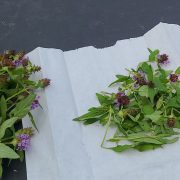I harvest Prunella when it is in flower, gathering the above-ground parts from select locations around the property. Sometimes it is ready earlier than mid-July, but this has been a rainy year, and the Prunella here are just beginning their lengthy flowering season. I have harvested them from our yard here in eastern Michigan as late as mid-October. The fact that it blooms right here on the property where I live — for three whole months or more — makes it easy for me to gather enough for the whole year, using the bulk of it in the winter months when we drink tea EVERY day. :D