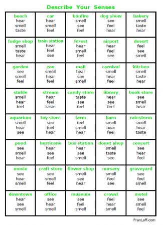 Use one box per day as a writing warm-up, or fill a section of your journal with these sensory experiences. One day you might describe what you smell, hear, and feel on a farm (real or imagined), the next day record dialogs you HEAR in your office… and on other days imagine what you would see and hear at an aquarium, or what you might TASTE at a candy store. Let your senses lead you on some mini writing adventures!
