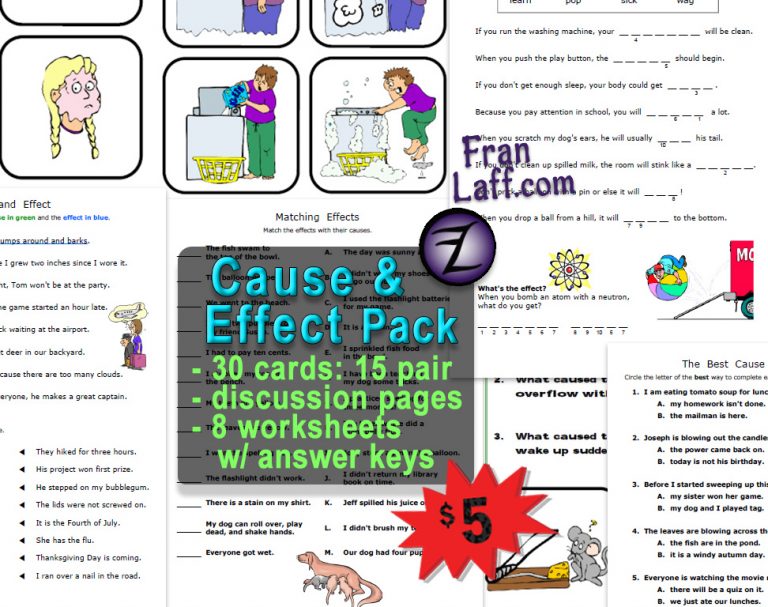 Within this pack there are 30 cards (15 pair of cause & effect "before & after" cards), 2 pages of discussion questions that go with the cards, plus 8 different colorful and fun worksheets with full-size answer keys.