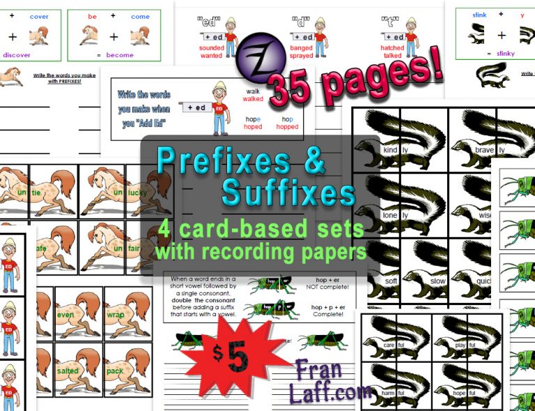 Practice adding English prefixes and suffixes with this set of 4 printable activity sets