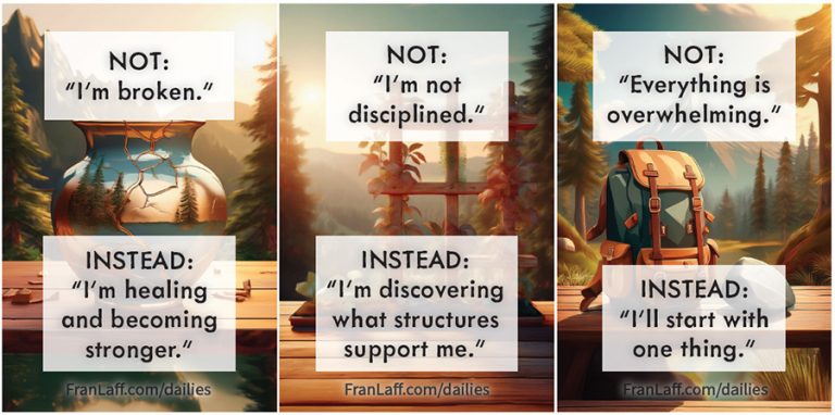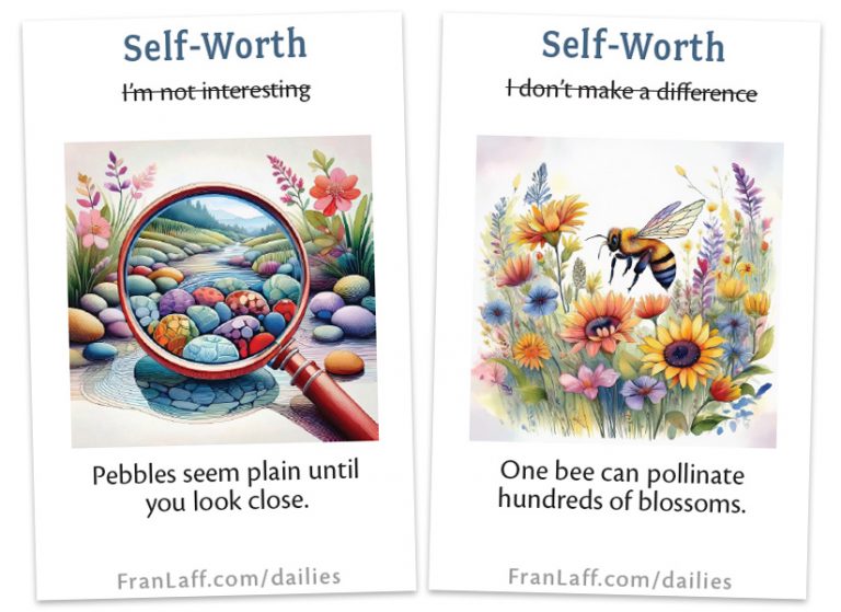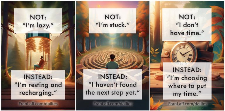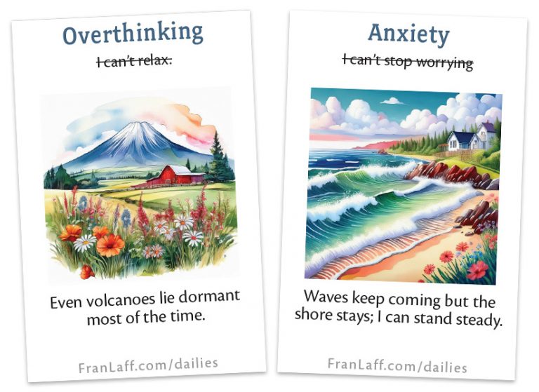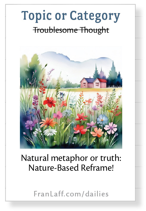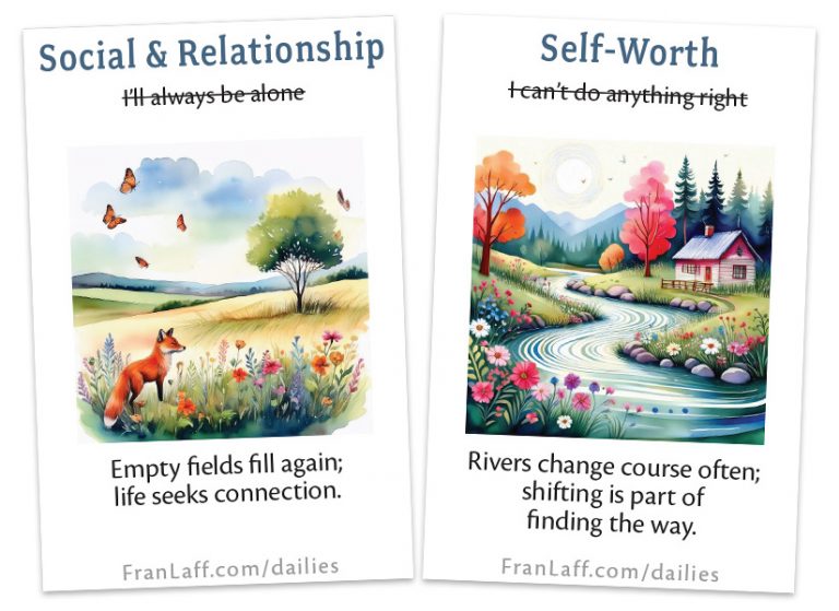 Each card begins with a common troublesome thought (e.g., “I’m falling behind”) and ends with a natural metaphor or truth (e.g., “Even seasons need rest between growth”).