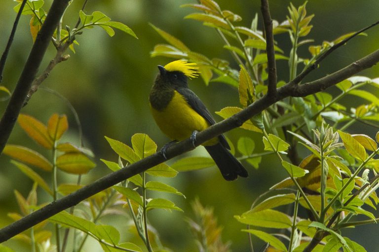 This bright, tropical-looking black and yellow bird from Southeast Asia is related to chickadees and titmice
