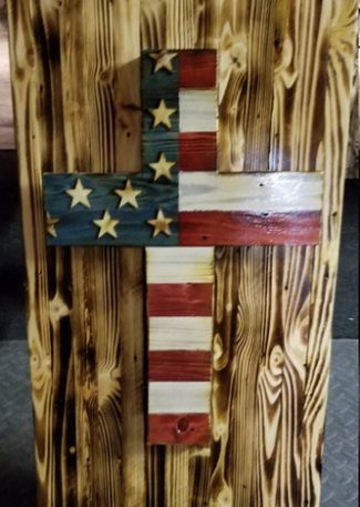 Wood American Cross Artistic wood cross painted with the American flag and mounted on a woodburned background, for sale on Etsy